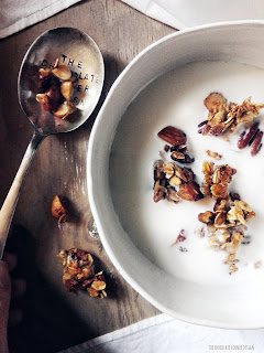 Granola days, quelle giornate in cui i cieli sono tersi e il vento spazza via anche i pensieri. Quando l'Inverno si muove lento ma senti già la Primavera nascosta fra i raggi di sole che trapassano il cuore. Allora forno acceso e profumo di sciroppo d'acero, di miele di bosco (con le sue mille proprietà) e di noci e mandorle tostate.